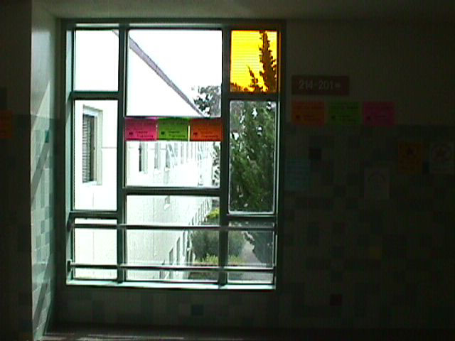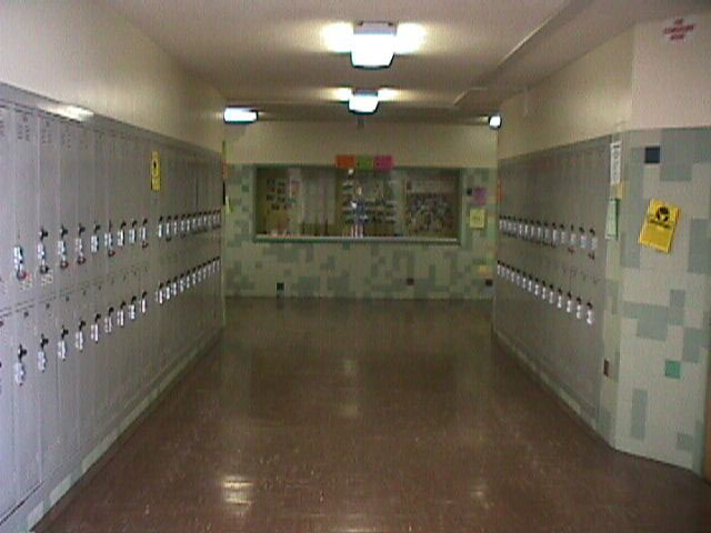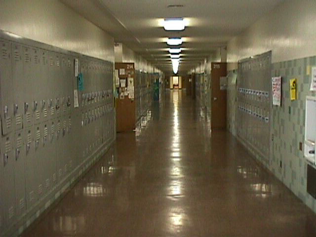 You are at the top of the stairs overlooking the quad.